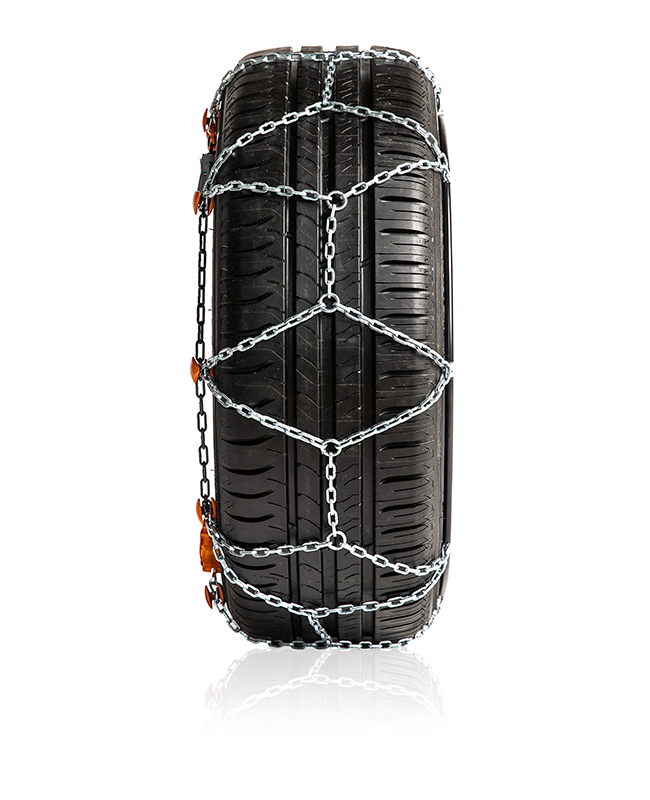 La catena da neve da 9 mm autotensionante ed autocentrante grazie ai due tensionatori automatici, priva di elementi metallici a contatto con i cerchi.